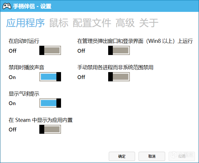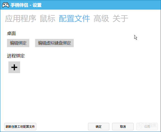 当我们第一次启动全屏软件时,手柄伴侣均会自动关闭以防止键位冲突,如果需要使用则可以在“配置文件”里绑定该应用程序并编辑键位。同时也可以在创意工坊里找到一些自制的针对特定游戏的配置文件,直接导入后使用即可。