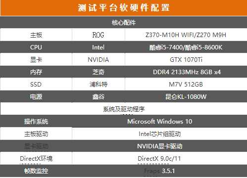 首先进行对比测试的项目是:Intel 第七代酷睿 i5-7400和第八代酷睿i5-8600k的对比测试,在其他硬件相同的情况下(除了主板),帧数到底会不会像“传说中”的那样会有很大的差距呢?