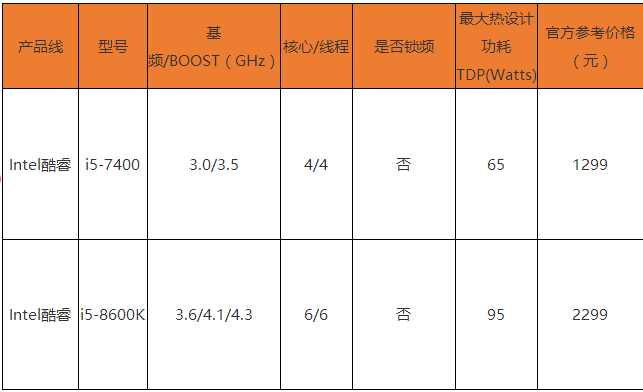 具体参数方面,酷睿i5-8600K默认主频3.6GHz,可多核睿频至4.1GHz,单核睿频至4.3GHz,目前官方报价2299元,酷睿i5-7400默认主频3.0GHz,最大睿频率3.5GHz,目前官方报价1299元。