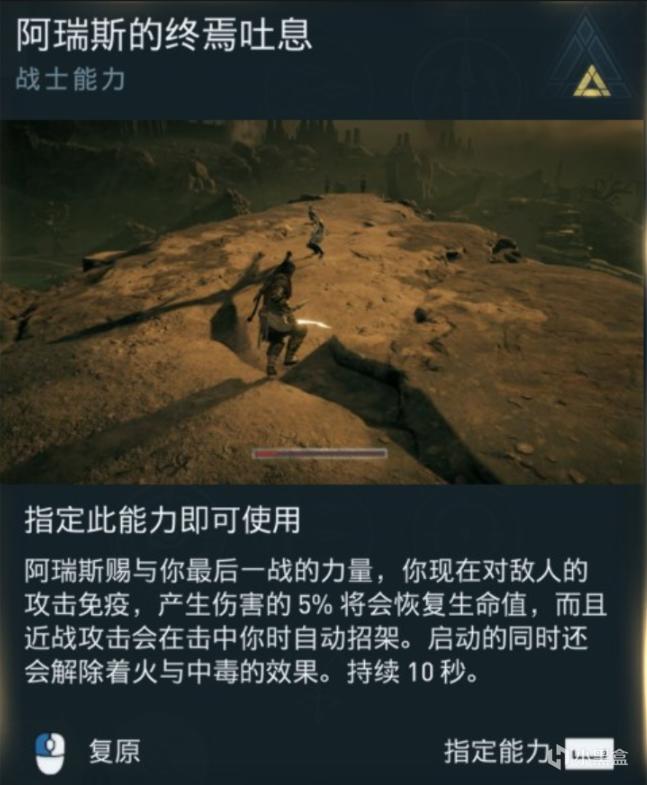 第三个技能是阿瑞斯的终焉吐息,对敌人的攻击免疫,产生伤害的5%会回血,而且近战攻击击中自己时会自动招架,使用此技能时自动解除着火和中毒的效果,持续共10秒。