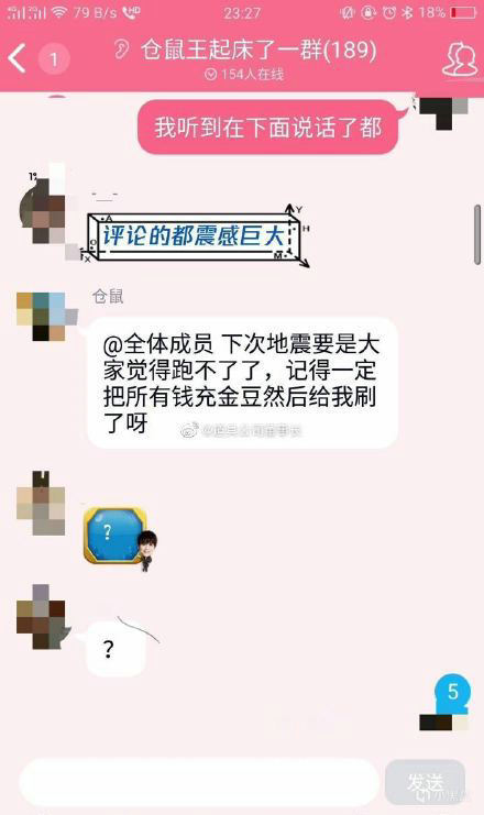 仓鼠王在粉丝群@全体成员方式调侃地震事件