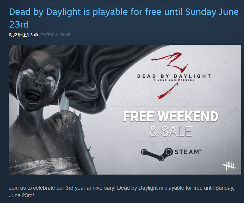 顺带一提的是,《黎明杀机》今天在Steam开启为期三天的免费周末活动,感兴趣的盒友可以去体验一下。