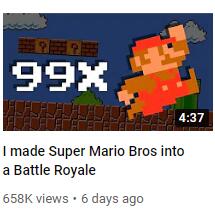 前几天,Youtube博主InfernoPlus上传了一段视频用于介绍自己制作的网页版《超级马里奥大逃杀》。在《超级马里奥大逃杀》中,99个玩家将会同台竞技并且最终最先到达终点的即为胜利,你也可以通过使用龟壳来淘汰别人。