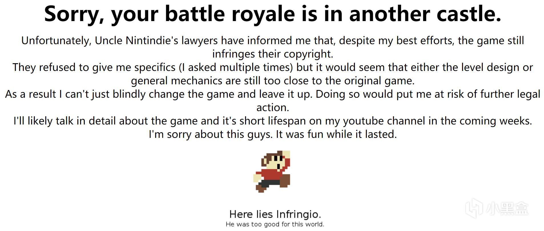 不过这仅仅是一款网页小游戏,并没有获得相关的版权允许。很快,他便收到了由任天堂发出的DMCA警告,这意味着所有属于任天堂的资源将不可用,于是他立即替换掉了侵权资源,并把游戏名改成了《DMCA大逃杀》。新闻链接
