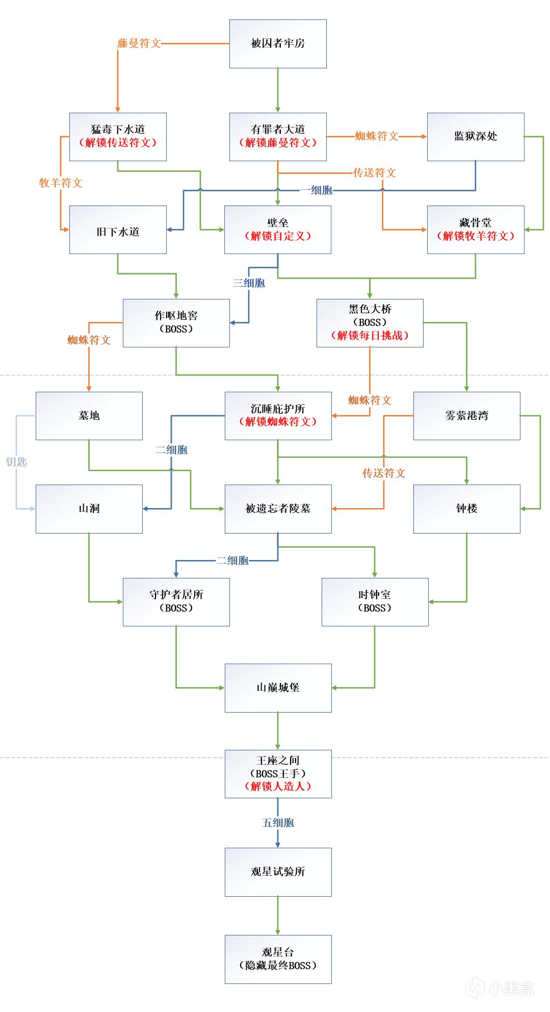 路线二:被囚者的牢房→有罪者大道→监狱深处→藏骨堂→黑色大桥(BOSS)->雾萦港湾->被遗忘的陵墓→守护者的居所(BOSS)/时钟室(BOSS)→山巅城堡→王座之间(BOSS)