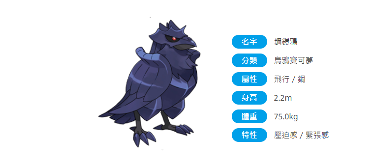钢铠鸦(超极巨化后)身上的钢铠得到强化用巨大的翅膀接住超极巨化能量产生的上升气流,从而能够停留在空中与对方宝可梦战斗。由于身上的钢铠得到了强化,所以就算遭到地面上的宝可梦攻击,也能毫发无伤。