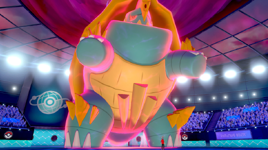 暴噬龟(超极巨化后)用巨大的身躯压扁对手受超极巨化的力量影响,变得能够用后肢站立,直立行走。由于保持站姿,所以可以直接利用自身的巨大躯体,倒下将对手的宝可梦压扁。