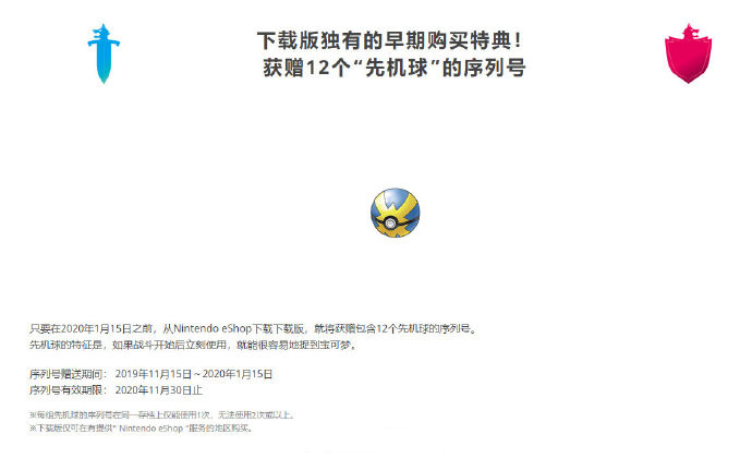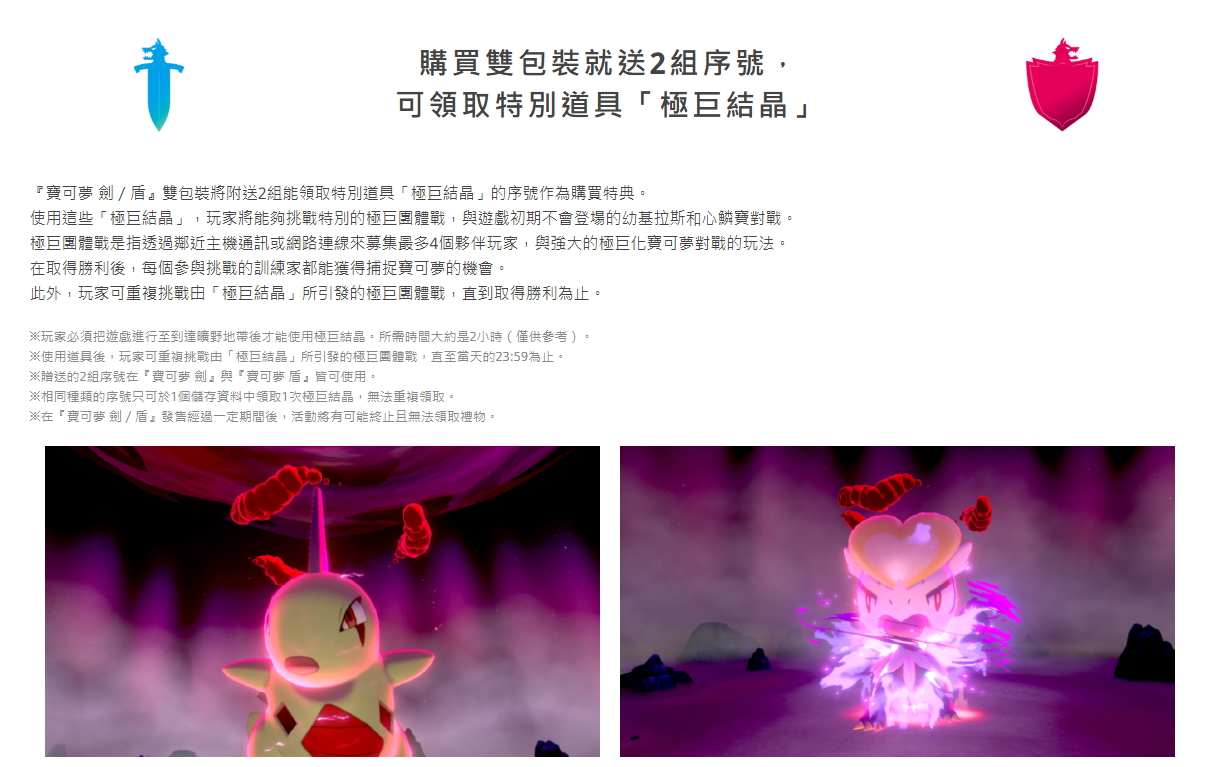 最后是关于游戏预购内容:购买双包装赠送 2 组专属宝可梦序列号,可获取特别道具“极巨结晶”。至于下载版,早期购买特典为 12 个“先机球”的序列号。