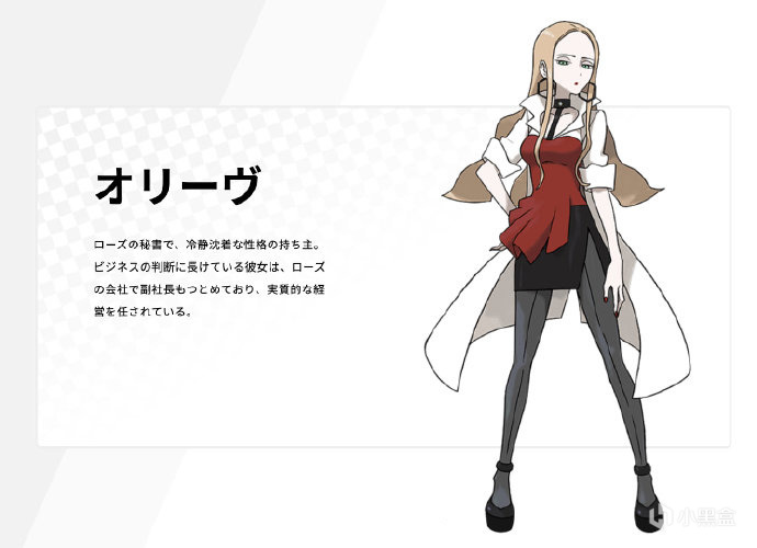 奥利薇:洛兹的秘书,性格沉着冷静。擅长各类商业决断,担任着洛兹的公司的副总裁一职,公司实质上的经营由她一手包办。
