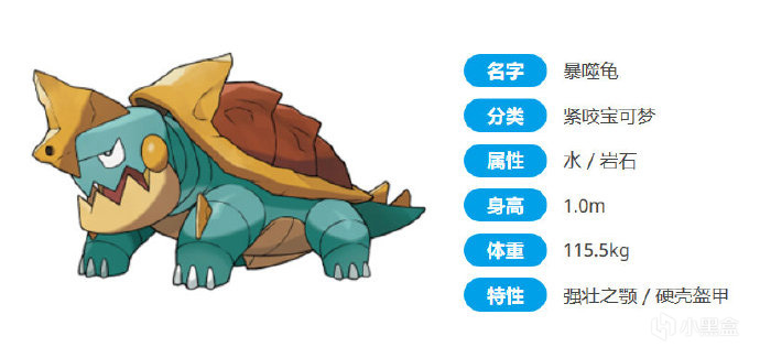 强健的牙齿与肌肉紧咬宝可梦暴噬龟那锯齿状的牙齿既锐利又强劲,甚至连岩石和钢铁都能够咬断。虽然背上的岩石甲壳非常沉重,但靠着一身健壮发达的肌肉依然能够动得灵活自如。