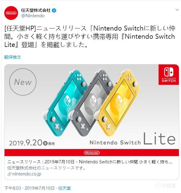 今天晚上,任天堂官方推特宣布发售全新的Nintendo Switch Lite主机,该主机将于9月20日发售,售价为19980日元。