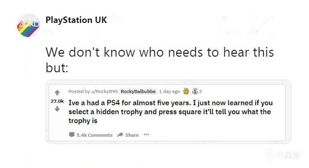 不久前PS英国的官推介绍了一个豆知识:在隐藏奖杯的详细页面上按方块键即可以查看奖杯的详细内容。不少网友表示惊讶,因为从来不知道这些用法。