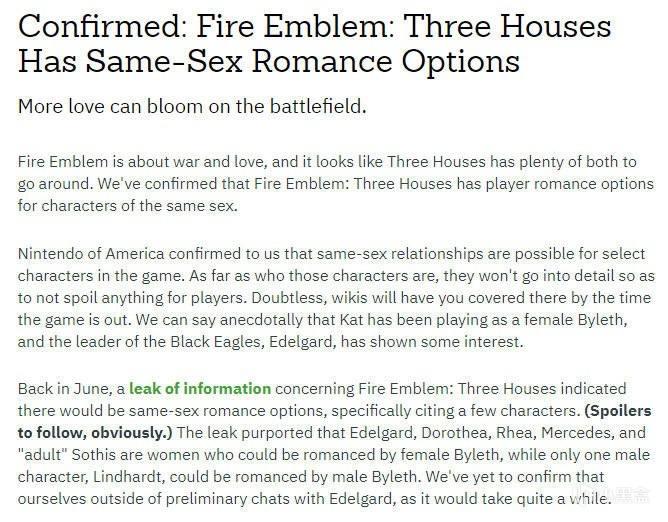 美国任天堂表示《火焰纹章:风花雪月》中,玩家可以和同性NPC建立S级亲密(恋爱)关系。根据目前的情报,三位级长可能都是可攻略的,但是其中只有黑鹫的皇女艾黛尔贾特能够发展为同性关系的NPC,其余可攻略角色则涉及剧透。