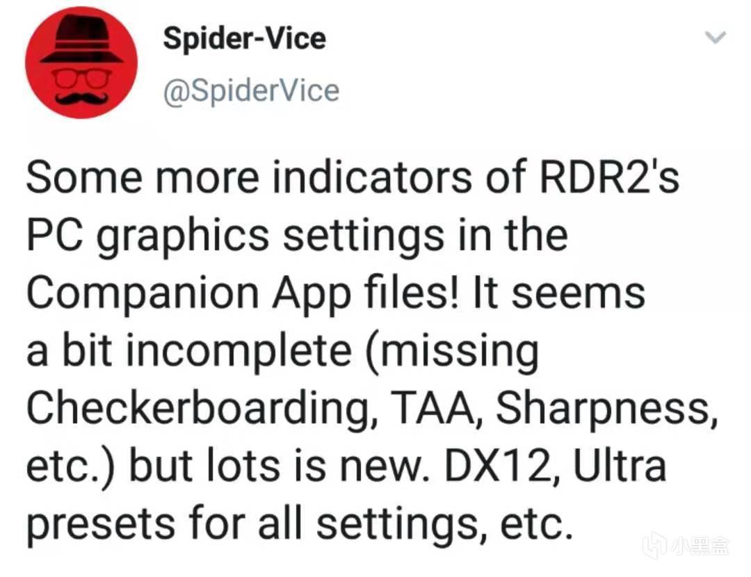 Spider-Vice在评论回复中表示,《荒野大镖客:救赎2》将支持DX12,在图形设置上,PC版使用了《GTA5》PC版的部分设置,此外《荒野大镖客2》PC版的所有图形选项都有“超高”选项,但是《侠盗猎车5》中并无该选项。