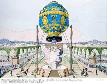 1783年9月19日,蒙哥尔费兄弟应法国国王路易十六和法兰西学院的邀请,前往凡尔赛宫进行热气球的表演。兄弟两人在气球下面系吊了一个大笼子,放入了羊、鸡、鸭各一只。热气球在空中飘行近8分钟后缓缓下降,而这个热气球也被公认为世界上第一个热空气气球。
