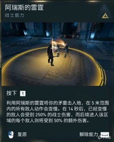 阿瑞斯的雷霆是混沌之环的进化版,能减缓敌人一切动作的速度,推荐在敌人倒地时使用,相当于直接眩晕好几秒。