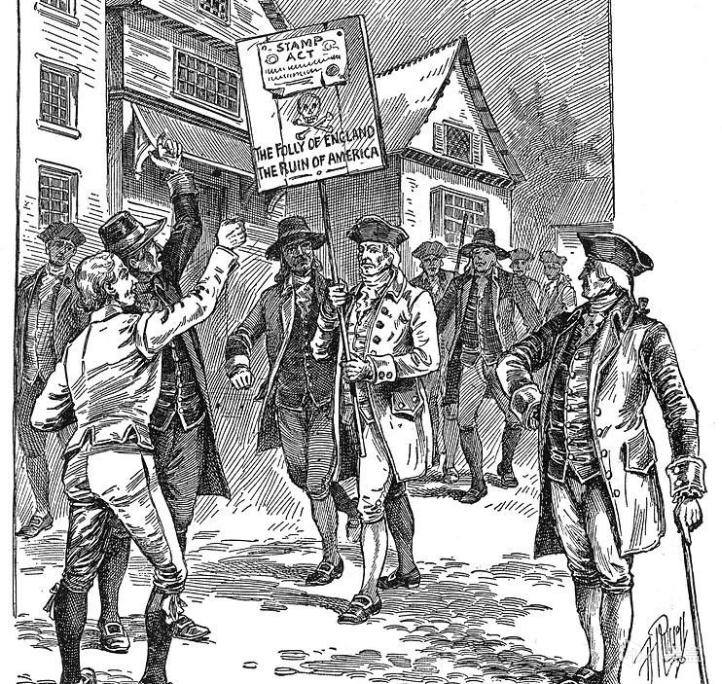 《印花税法案》是第一部直接施加在美国殖民地人民的纳税法案。法案要求美殖民地的印刷品(例如报纸、宣传册、广告、信件、结婚文件等等)都使用伦敦特制的带有浮雕印花税票的印花纸,每张印花纸都代表半个便士到20先令的税费。但法案颁布尚未实施,就遭到了北美殖民地的一致反对,没人愿意结婚还要交这么一笔冤枉钱。殖民地人民当街焚烧印花税票,挥舞标语,有人甚至拔出了佩剑和卫兵发生冲突。