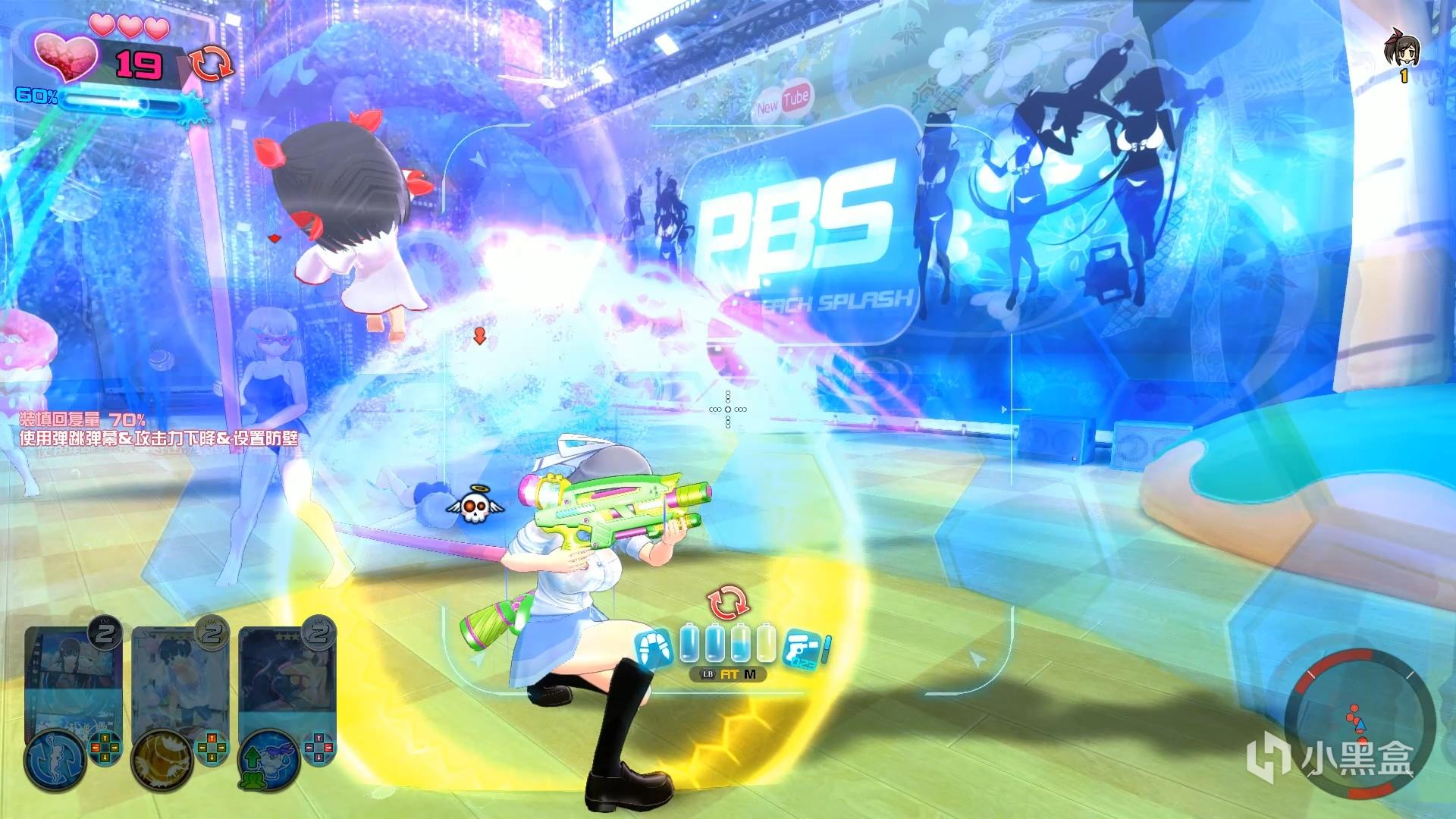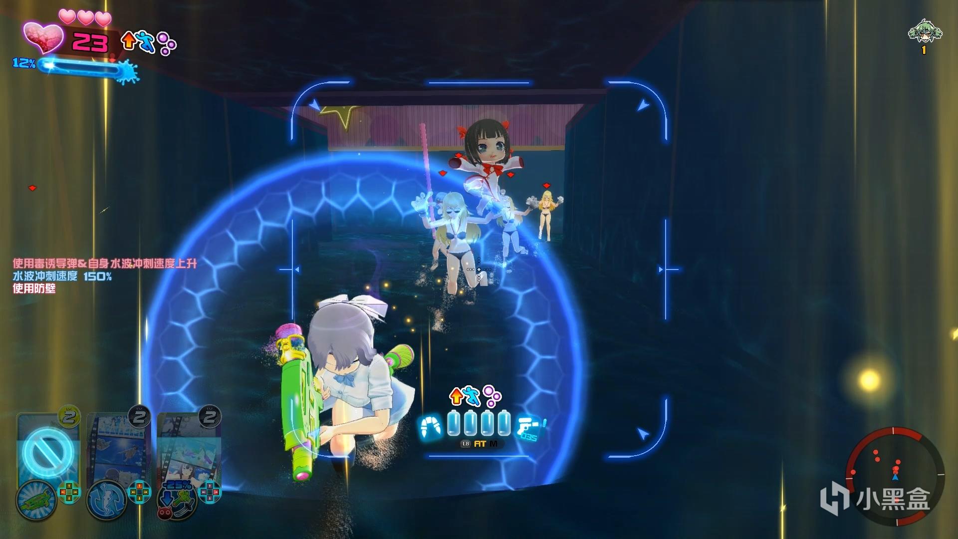 虽然少女们被水枪喷倒以后楚楚动人的样子确实很吸引人,但这并不是一个“只注重结果不注重过程”的低级游戏,对战的过程也还是挺有乐趣的。从观感上来讲和任天堂的《色彩喷社团》(splatoon)很像,武器的种类也非常多,各类水枪都有不同的操作体验。根据武器不同,也有不同的突进方式。而且“射击”并不是对战的全部,“技能”也是非常重要的一个部分,而《桃色沙滩》的技能则是用时下很流行的卡片来进行组建。