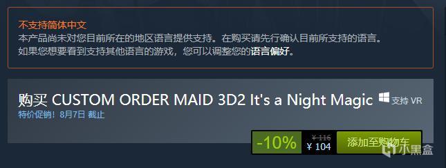 本次的《3D定制女仆2》原价为116元,而首周特惠为九折,也就意味着你可以以104元的价格在8月7日前获得这款游戏。游戏不支持中文,仅支持英语的界面和字幕。相比于需要VR补丁的原版,Steam版本的《3D定制女仆2》将原生支持Valve Index、HTC Vive和Oculus Rift三款VR设备。