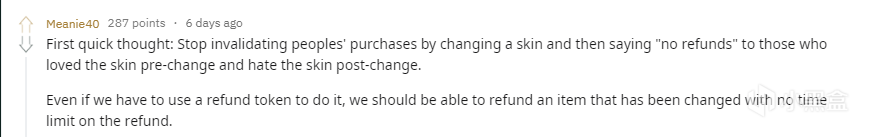 一个小想法:别再让人们为修改后的皮肤买单然后还对这些爱着老版皮肤而厌恶着重做的皮肤的玩家说“拒绝退款”了。