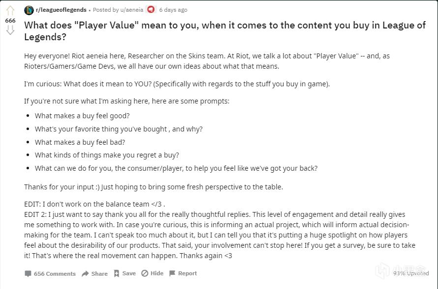 大家好,我可能是野生皮卡丘。英雄联盟至今已有145个英雄,1867个皮肤(是的,就是这么惊人的数字。当然,包括换汤不换药的炫彩皮肤),有些皮肤的特效与细节都十分精致,但有些皮肤则让人感觉不如拿钱去买两包硬中。近日,拳头公司的一名员工在论坛上发布了这样一则帖子,询问网友们玩家价值在英雄联盟内是如何体现的: