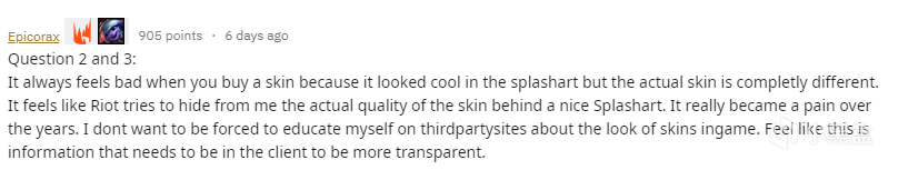 事实上,每当我买皮肤的时候,我感觉都很糟糕,因为尽管宣传海报里的皮肤看起来非常的cooool,然而到了游戏里皮肤的实际效果看起来大打折扣。这就感觉像是拳头试图用虚假的宣传来向我们玩家隐瞒着皮肤的真正品质。这么多年过去了,这一直是我心头上的痛。我不想强迫自己去习惯在买皮肤之前先去第三方游戏网站看下皮肤的游戏内效果。我认为这个问题应该马上得到解决。