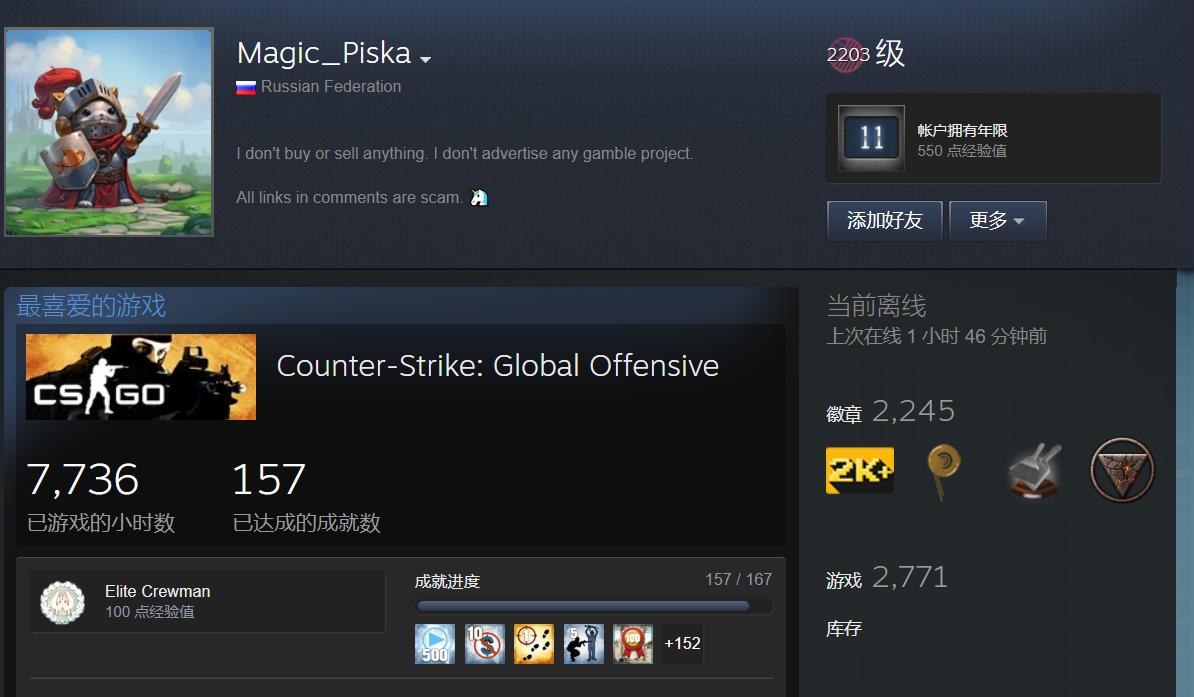 排名第二的是来自俄罗斯的玩家Magic_Piska,空间更是朴素得惊人,只放了最喜爱的游戏CSGO,个人简介写着:我不买卖任何东西。我不做任何赌博项目的广告。评论区所有连接都是诈骗。看来是位性格豪爽的俄罗斯兄弟。