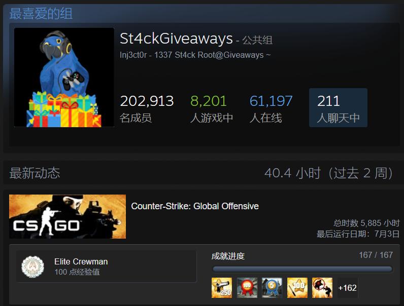 这位土豪的个人资料页倒是简简单单,除了自己的logo和几张照片之外,没有使用任何背景以及饰品等展柜,只放了自己的公共组。游戏方面最爱的是CSGO,达到了5885小时。据说他购买饰品时出价令人很难拒绝。