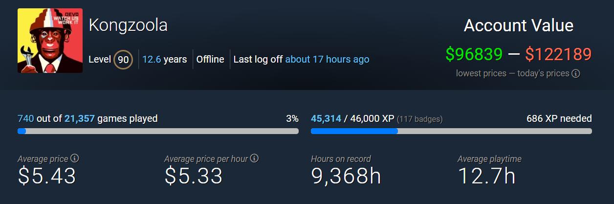 排在第一名的是来自美国的Kongzoola,目前拥有21875款游戏。这是一位游戏媒体行业的从业者,在获取游戏方面有厂商提供key等等便利,因此在steam游戏日益增多的今天,这种优势还将扩大,第一位置可能保持很久。