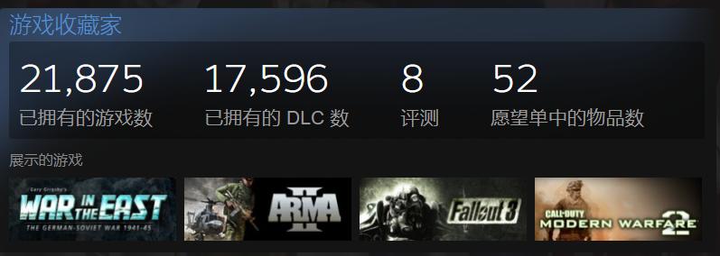 出于好奇,我浏览了愿望单中的52个物品,全都是未发售的游戏。而根据steamspy的统计,目前steam游戏的总数量是23315。除去软件、测试版等等误差,这个媒体号没有拥有的游戏应该为数不多了。