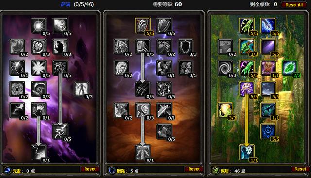元素萨:为啥一再建议大伙玩元素萨,成型简单、攻守兼备,玩着不会太憋屈,算是60年代萨满最好的PVP天赋。天赋依然建议30/0/21,补伤害、保自己的万金油天赋。闪电链和震击都是6秒CD,完美契合,闪电链接地震术尽量要每次都配一起出手(除非要留打断)。