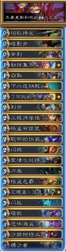 各位小伙伴大家好吖,骗尘瓦再次上线,这是我最近使用的一套宇宙贼卡组,打出了一波18局17胜1负的好成绩,英雄乱斗也成功打到了12-0。这套宇宙贼由剽窃任务体系,跟班国王体系和钩牙海盗体系组成,当然最最核心的还是杰弗里斯和过牌,卡组的获胜思路主要靠节奏压死和剽窃拖死对面。因为盗贼可以靠暗影步和咖啡师林彻反复召唤杰弗里斯,所以上限极高。
