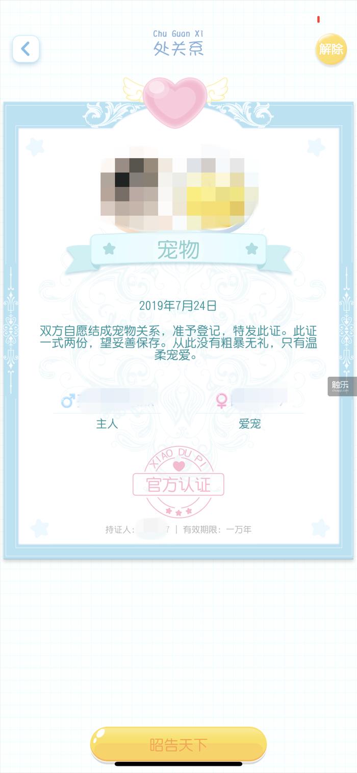 这款游戏自称“社交养成平台”,但实际上这个世界里拥有“千余款精美服饰和丰富有趣的剧情任务“,开发者骄傲地写“以虚拟游戏的形势(原文如此)结合线上线下的内容和活动,实现用户自身的素质养成与见识增长。“开发者似乎想让我们认真地对待这份关系。游戏向双方提供了一份协议,协议上面写:“双方自愿结成宠物关系。此证一式两份,愿妥善保存。从此没有粗暴无礼,只有温柔宠爱。” 底下有一个“官方认证”的红章,章里有一颗红心。