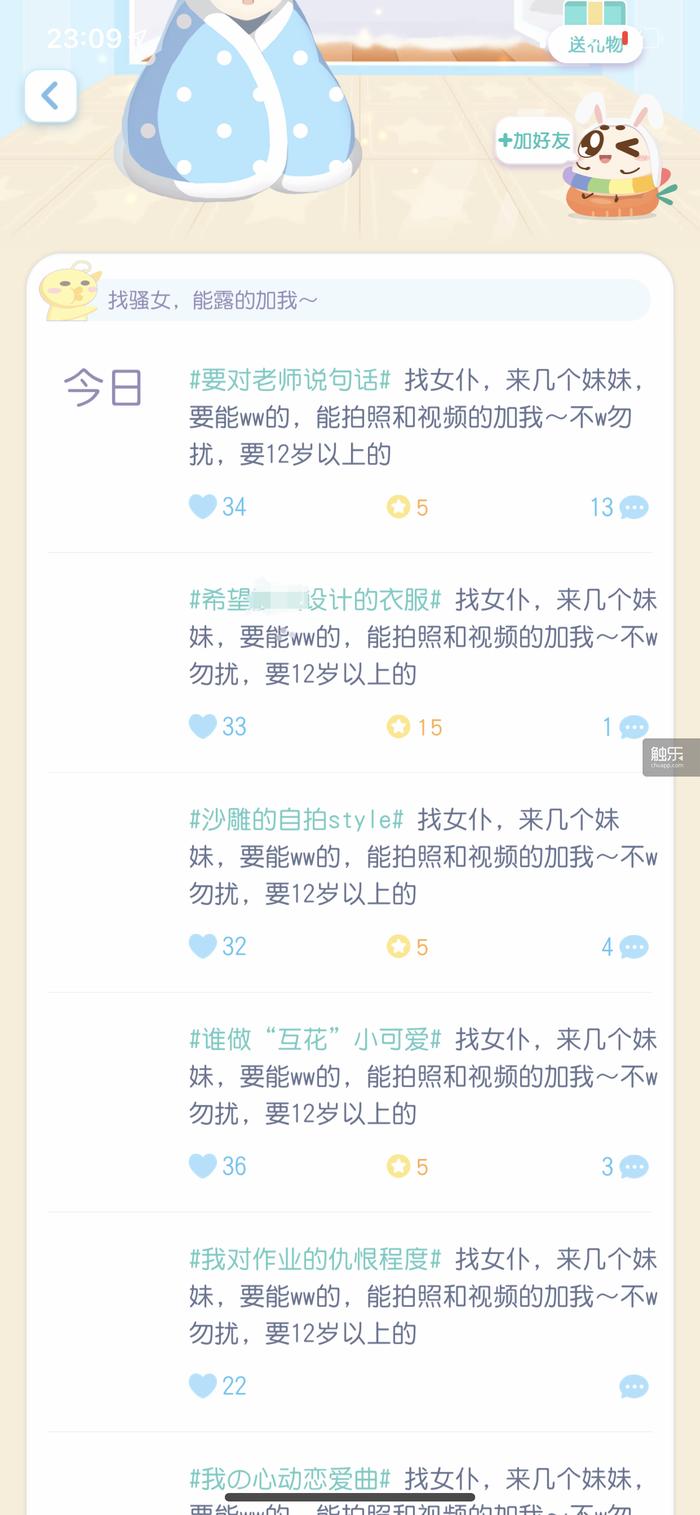 “(我也)不知道是不是很普遍,但是遇见过就对了。”蜂蜜抽子告诉我,不光是在儿童游戏中,她们自己的QQ小群也会有“变态”闯入,逐个私聊群内成员。