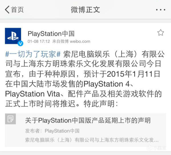 来年的1月8日下午,PlayStation中国官方微博发布消息称——原定本月11日发售的PS4与PSV由于种种原因,只得延期发售,并对玩家与粉丝表达了歉意。与此同时,各大预售商城陆续下架索尼游戏产品,退还预购定金。