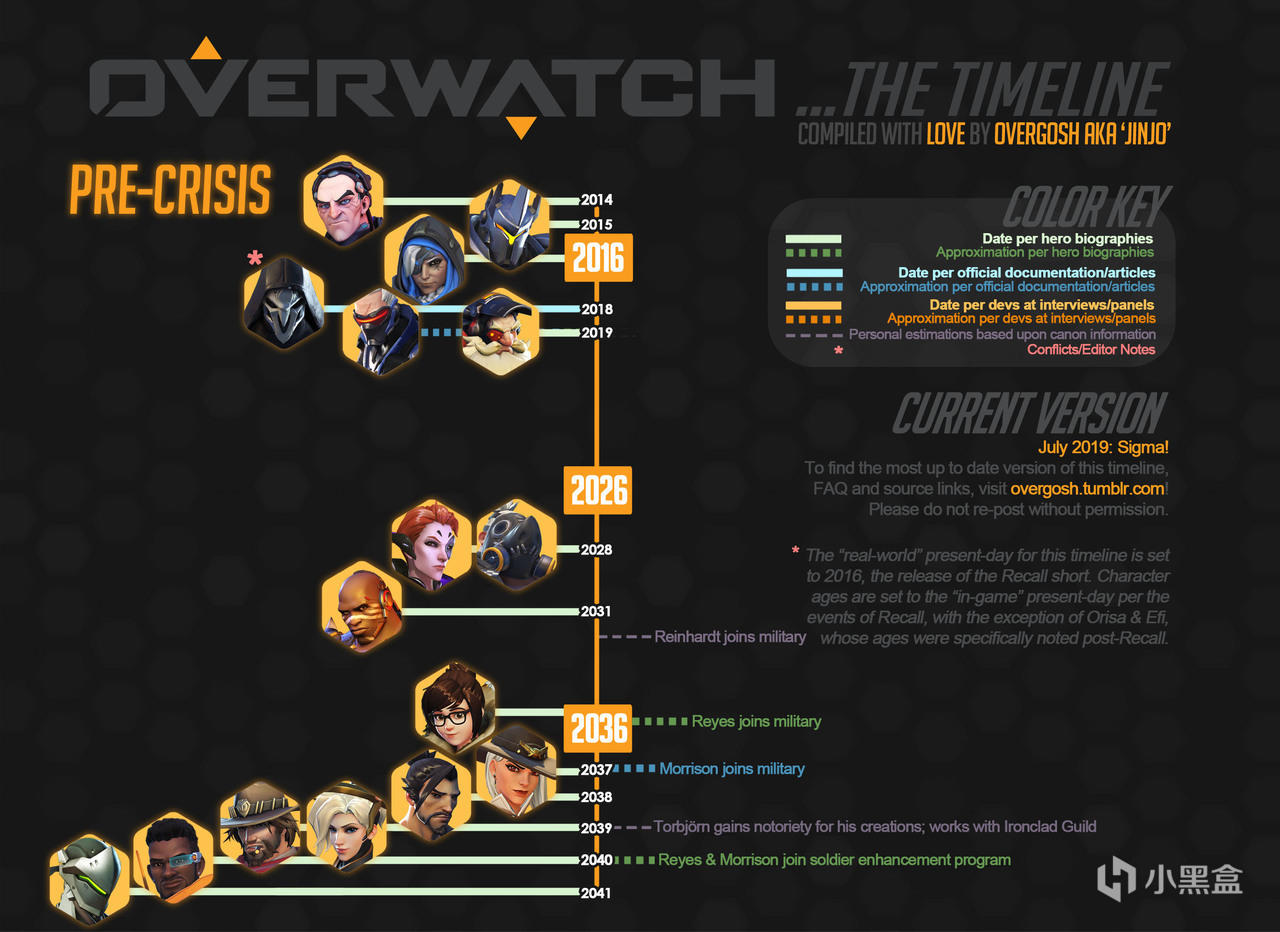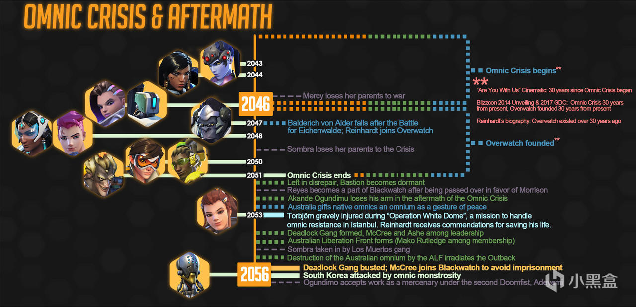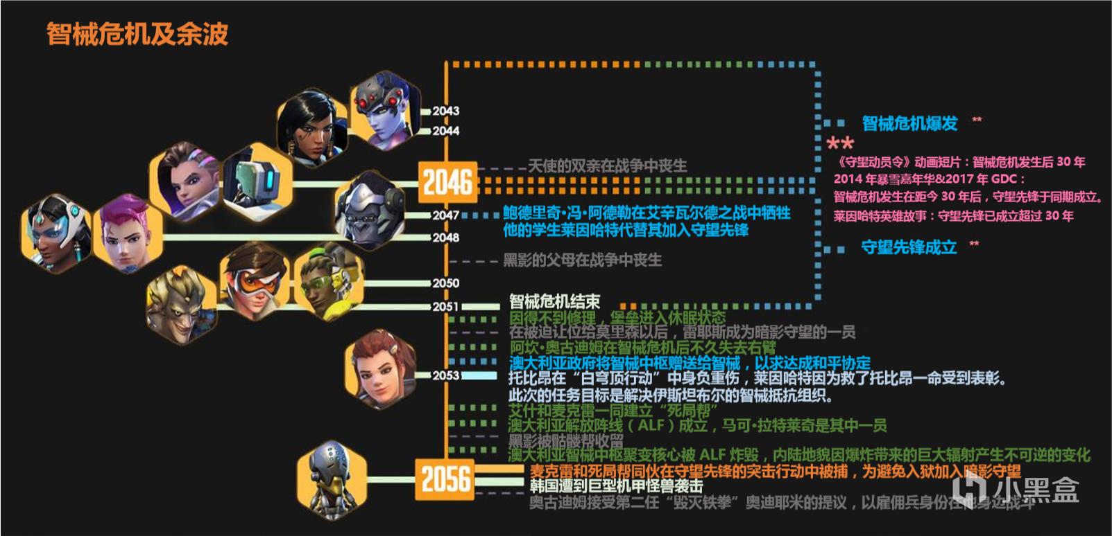 注意:任何不“确定”的日期都可能有与之相关的一年(甚至数年)的摆动空间!我为时间线上除智械危机和守望先锋成立以外的所有事件都选择了一年进行对应,但这只是一种简化的处理,最终解释权归暴雪所有,我只是尽己所能地理清时间线。