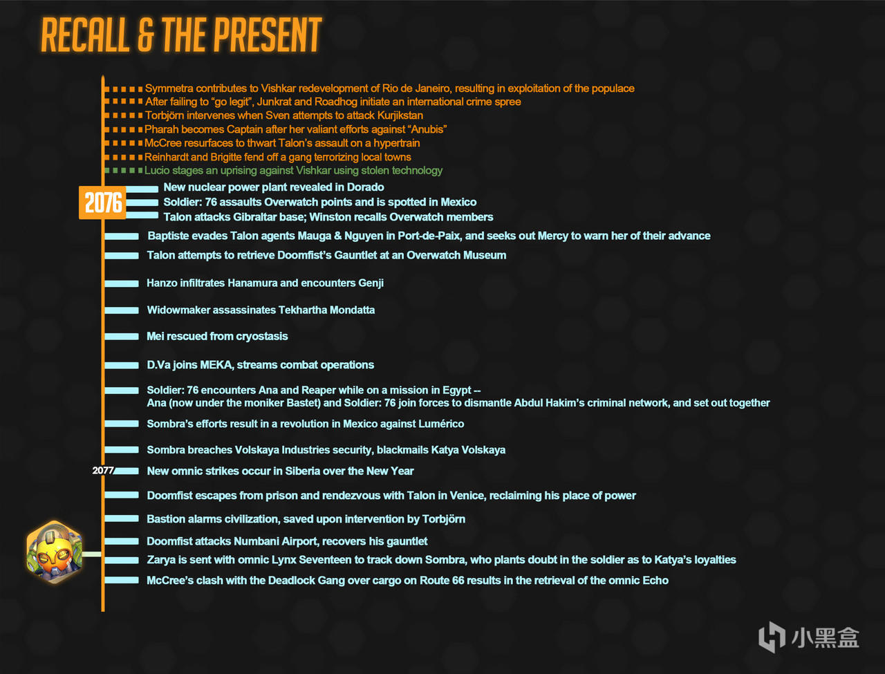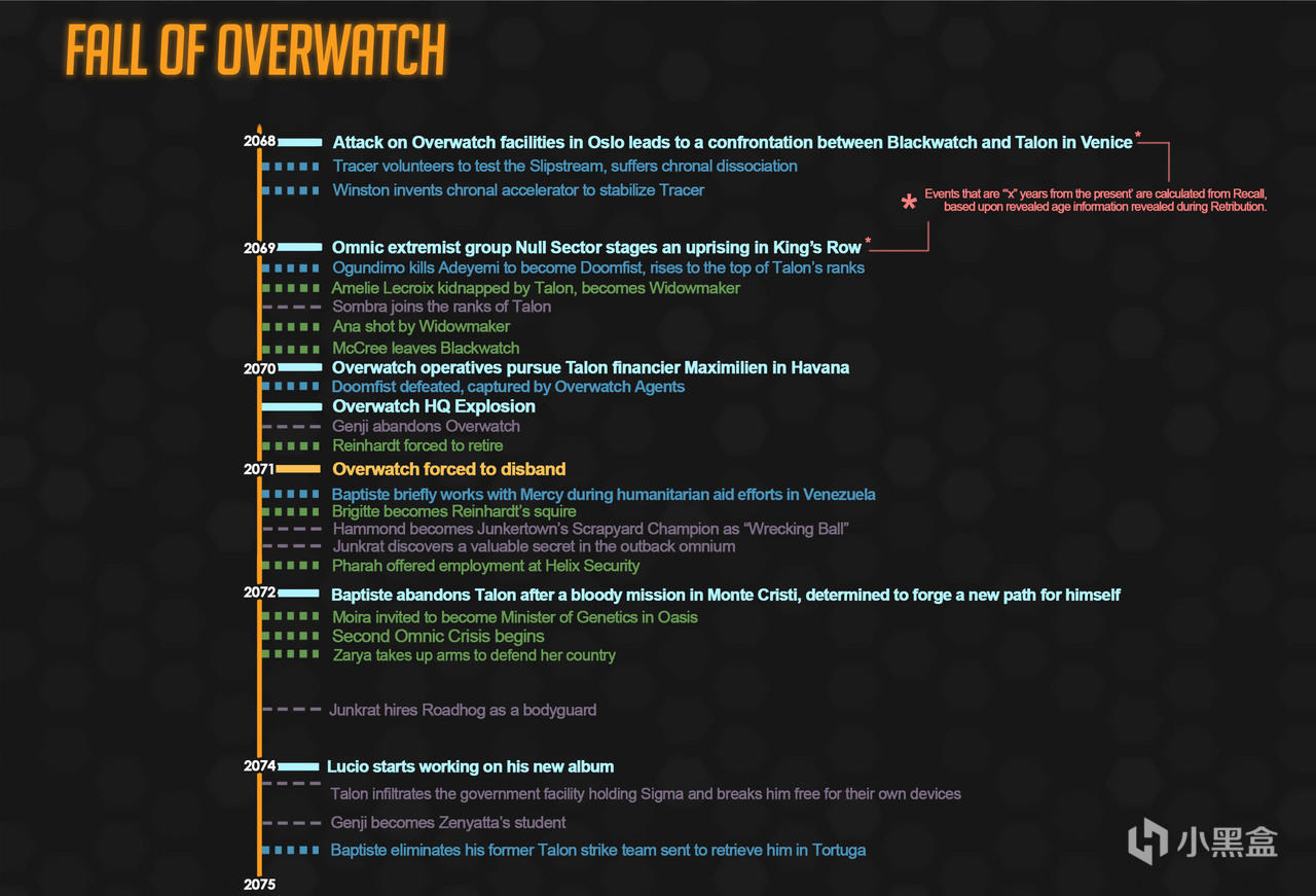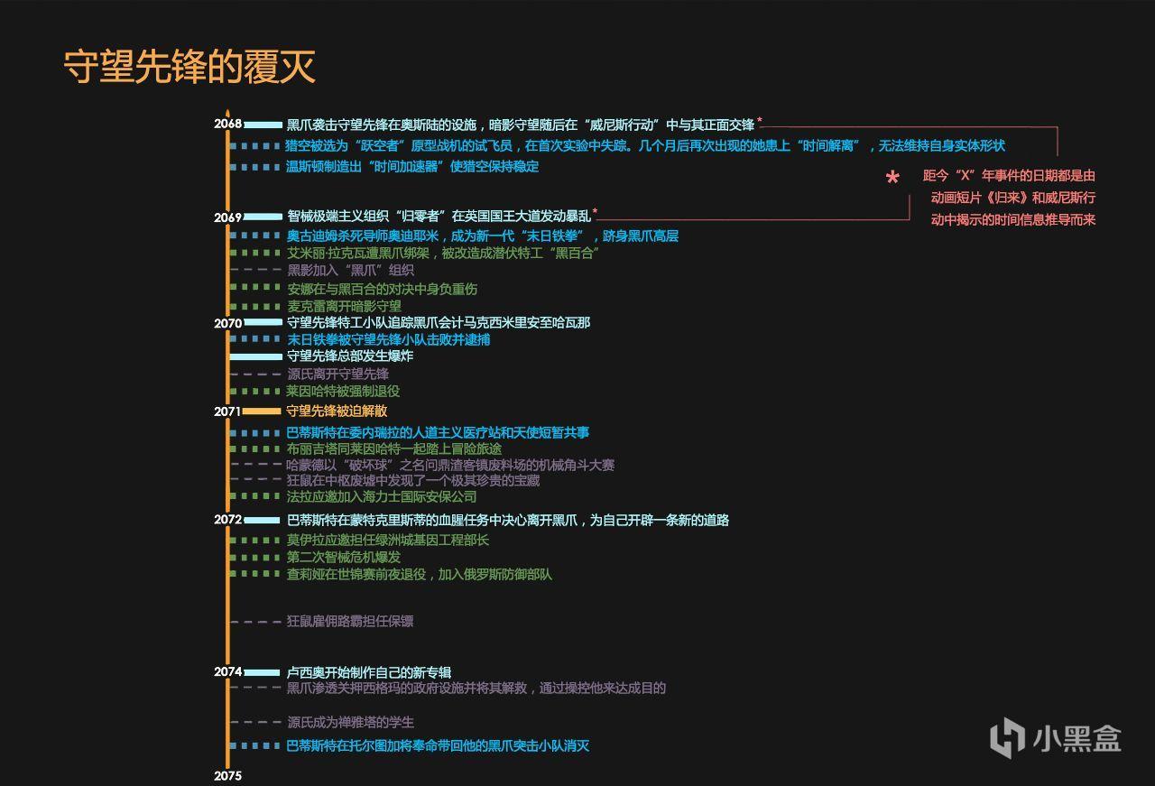 注意:任何不“确定”的日期都可能有与之相关的一年(甚至数年)的摆动空间!我为时间线上除智械危机和守望先锋成立以外的所有事件都选择了一年进行对应,但这只是一种简化的处理,最终解释权归暴雪所有,我只是尽己所能地理清时间线。