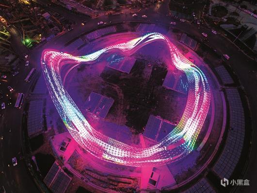 作为中国最大体量钢结构公共艺术品——光谷综合体约8万平方米的景观设计,展示了武汉山水交融的城市地貌和“光谷科技之心”的城市文化。广场中心总重量近1410吨的钢结构“星河”雕塑骨架,如同7条飘带在空中舞动,通过密集的光源营造出“璀璨星河”效果。