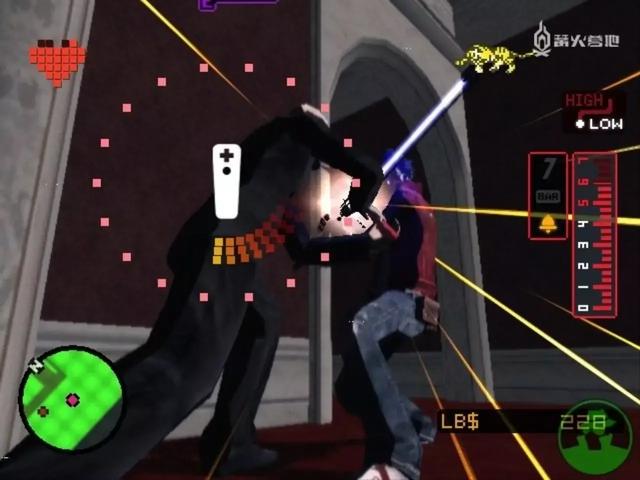 这款由 Suda51 工作室带来的砍杀类动作游戏,证明了任天堂家庭友好向的 Wii 体感主机也能驾驭更为「成年向」的游戏。特拉维斯手中的光刀,时不时需要玩家停下来摇晃 Wii 的控制器充能,才能继续四处制造混乱。而整个充能过程非常不可描述,怕玩家无法参悟其用意,屏幕上还有一个由软变硬的小玩意儿......