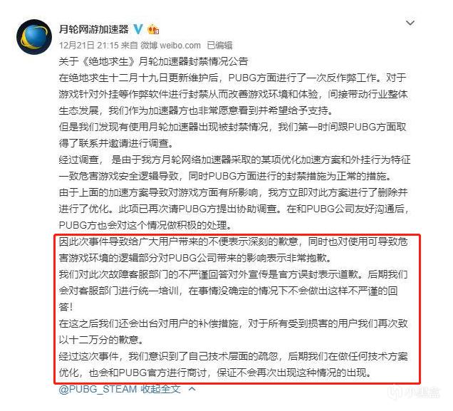当时月轮加速器更改加速策略后很多玩家都表示自己账号“误封”,但这都是因为反作弊系统检测到异常,月轮加速器的加速策略和当时新推出针对雷达外挂的反作弊程序相吻合才导致被封,虽然对这一批玩家官方进行解封了,但这也不叫误封,出来道歉的是月轮加速器,而不是PUBG官方。