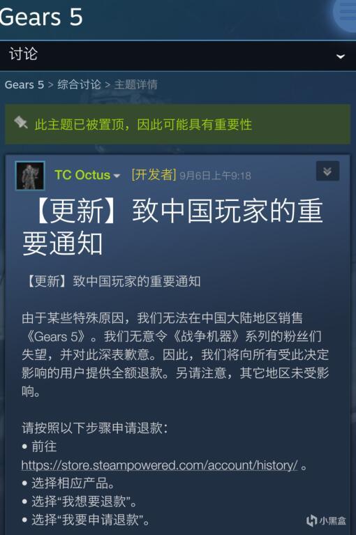今天早上,《战争机器5》在Steam上更新了致中国玩家的公告: