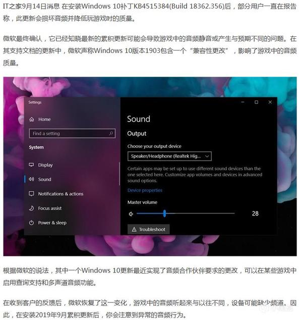 IT之家9月14日消息 在安装Windows 10补丁KB4515384(Build 18362.356)后,部分用户一直在报告称,此更新会损坏音频并降低玩游戏时的质量。