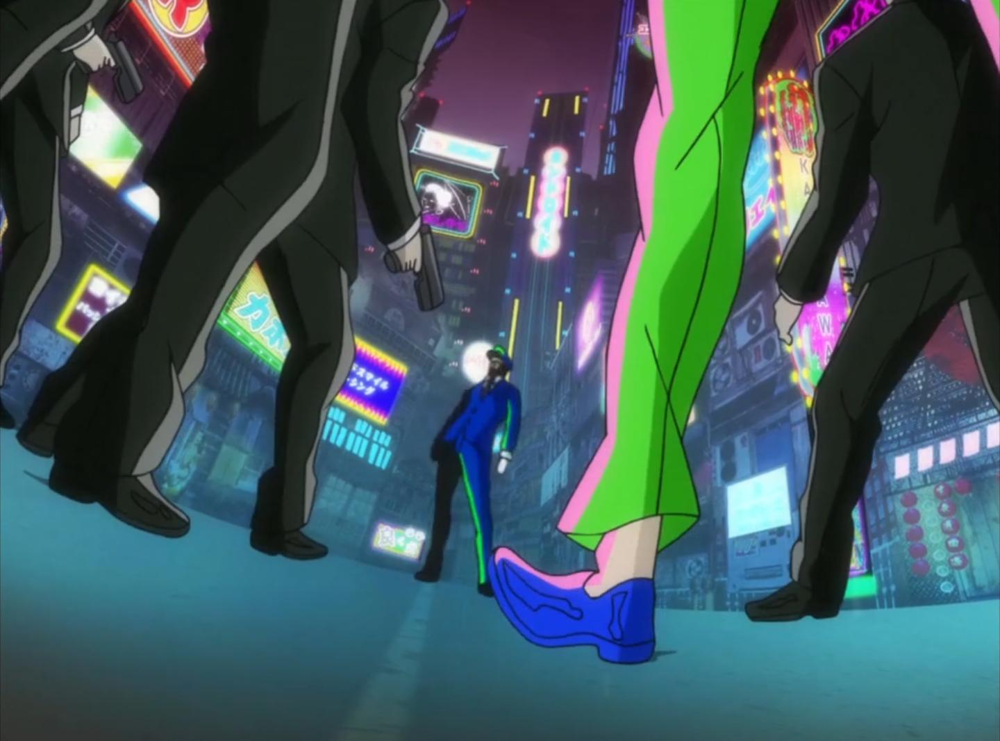 这些看上去与当时业界背道而驰的设计的确非TRIGGER所能为,其画风之诡异让笔者初次见到这部作品的时候,实在想不到除TRIGGER之外还有那个公司胆子大到这样的程度,也正是这些背道而驰,将原作中的那股赛博朋克体现的淋漓尽致,在劝退了一部分人的同时也吸引了大批忠实粉丝,“不会动”的flash动画看起来虽然略显拙劣