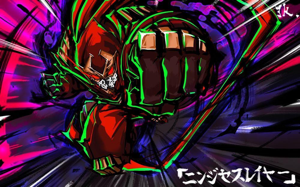 原作本是上世纪美国人基于对日本忍者的印象写出来的,作者把自己了解的日本文化(能看出还混了点中国元素)全部杂糅在一起,但故事的本质还是美式英雄。小说经由本兌有、杉ライカ等人在Twitter的粉丝翻译成了日文,在日本发出来了,机翻加上小说本身就天马行空,结果就成了不知道什么玩意。充斥全篇的莫名其妙拟声词就是这么来的。但这后来反而成了忍者杀手的特色,“忍杀语”,其中“Aieeeeee”荣获2015年上半年动画流行语银赏(对于忍杀语的整理将会在文末补充「1」),这些莫名其妙的忍杀语加上作品无厘头的设定,使得《忍杀》品尝起来莫名的带感,一拳将敌人打的大幅扭曲变形的作画表现....实际可怕!但想起来自己看的是《忍杀》这样的夸张也自然变得理所当然,作品的毒性也随着剧情的发展愈发强烈(南无三!如此魔性的动画实际厉害!)