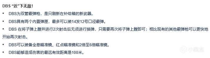 DBS作为空投枪械,仅刷新于空投补给箱内,弹容量14发,射击方式为两联发+上膛的形式,近似S686+S1897的合体,单发弹药内共9颗弹丸,伤害官方公布为26/弹丸。