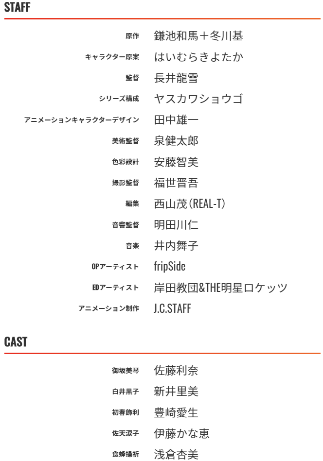 白井黑子(Kuroko Shirai),初春飾利(Uiharu Kazari)和佐天涙子(Saten Ruiko)等也将作为主要角色活跃于本作。TV动画『とある科学の超電磁砲』第一季开播于2009年,OVA于2010年10月制作,第二季『とある科学の超電磁砲S』开播于2013年 。
