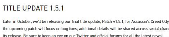在博文中,育碧也表示官方将于10月上线最后的内容更新(v.1.5.1版本更新),未来的更新补丁将会专注于修复bug,更多的补丁信息未来会在社交频道公布。