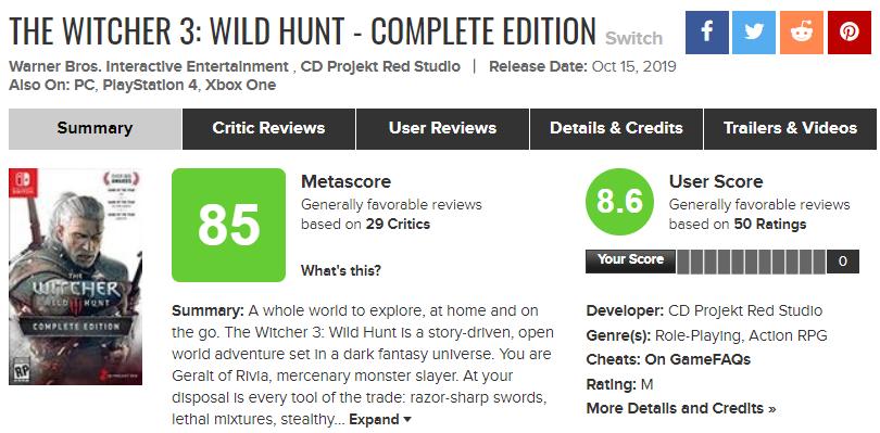 2015年年度最佳游戏《巫师3:狂猎》今天以完全版形式登陆Switch平台,目前MC上29家媒体打出平均分为85,IGN给出8分评价,认为这个版本是一次有野心的尝试,也有许多妥协之处。如果之前没有玩过《巫师3》,还是不推荐这个版本,NS版适合没有强力PC或主机以及想远离电视的玩家游玩。
