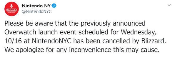此外今日也是《守望先锋 传奇版》登陆Switch的日子,暴雪临时宣布取消将于10月16日在任天堂纽约旗舰店举办的发售活动,承办方对所有原计划参与活动的玩家表示抱歉。