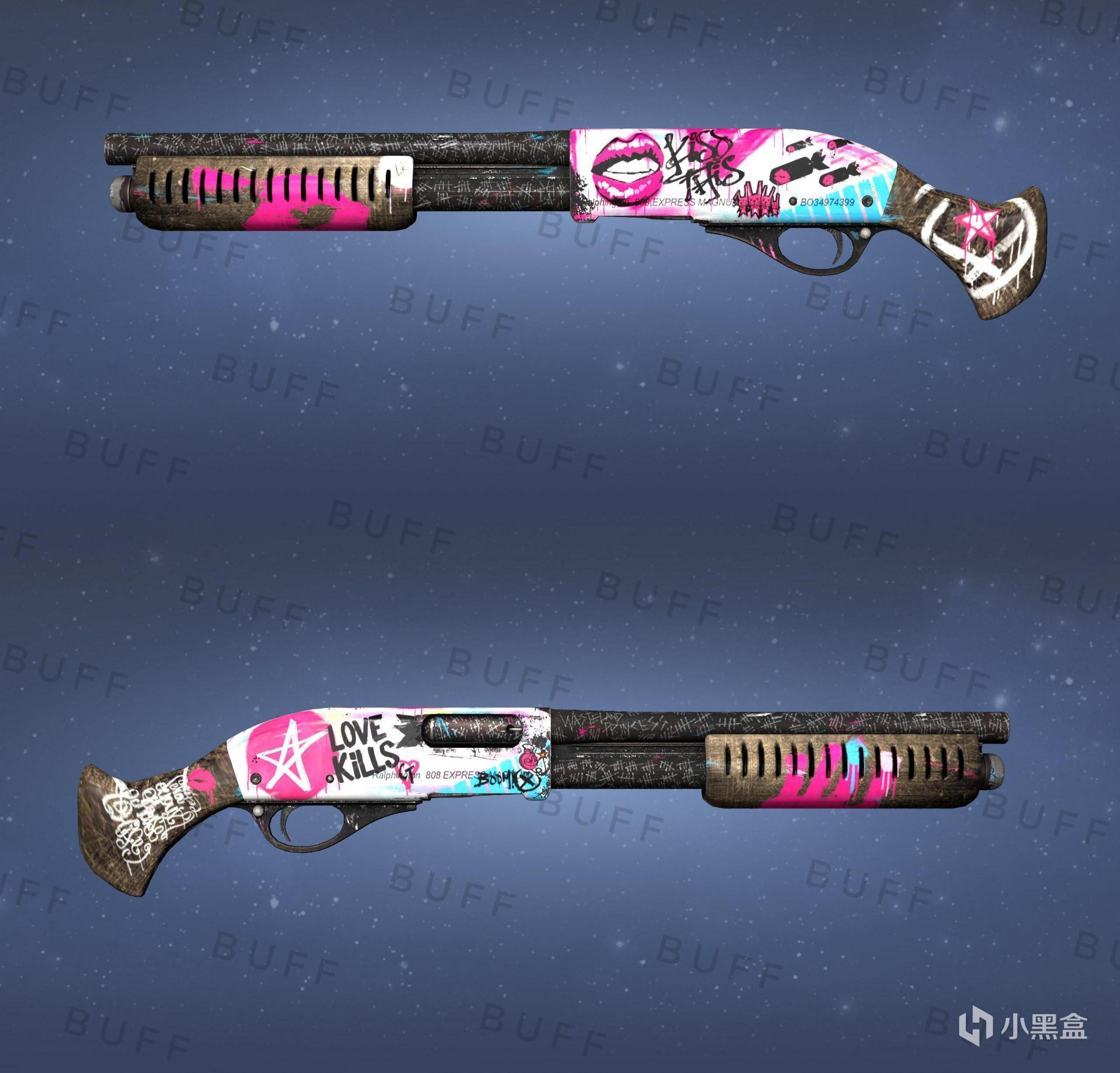 涂鸦风格,整体为粉红色,枪身有做旧处理,但图案细致,粗犷与精致并存。枪托处的五角星和死亡芭比粉的嘴唇颇为醒目。